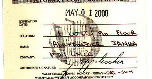 These passes gave them access to the entire WTC complex. The pretense was an art project called the “B-Thing,” and the group is called Gelatin. Note that the pass was valid for weekends.This may sound innocent enough for the gullible except for the fact that the photos — taken from the artists’ book called the “B-Thing” AND used in the Times’ article — from inside the 91st floor camp out revealed boxes stacked to the ceiling with the letters and numbering “BB 18” on the side.