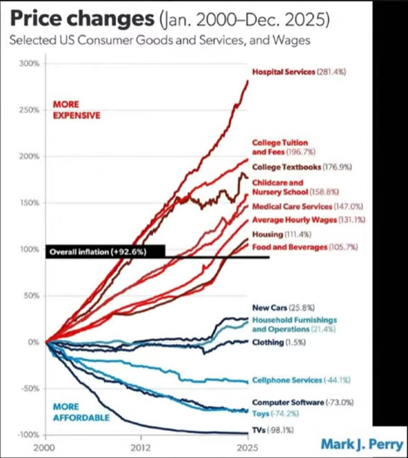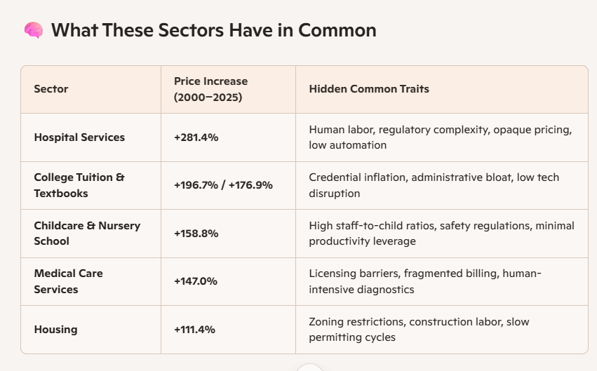 The goods and services that have skyrocketed—healthcare, education, childcare—share a hidden trait: they’re labor-intensive, regulation-heavy, and resistant to productivity gains. This isn’t just dollar devaluation—it’s a structural mismatch between sectors where tech and AI drive deflation, and sectors where human labor remains irreplaceable.