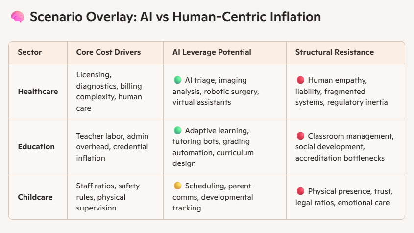Here’s a scenario overlay mapping how AI could bend the cost curve in healthcare, education, and childcare — the three sectors that have most resisted deflation despite tech advances. These are the inflationary outliers in your chart, and they share deep structural traits: labor intensity, regulatory friction, and low productivity leverage.