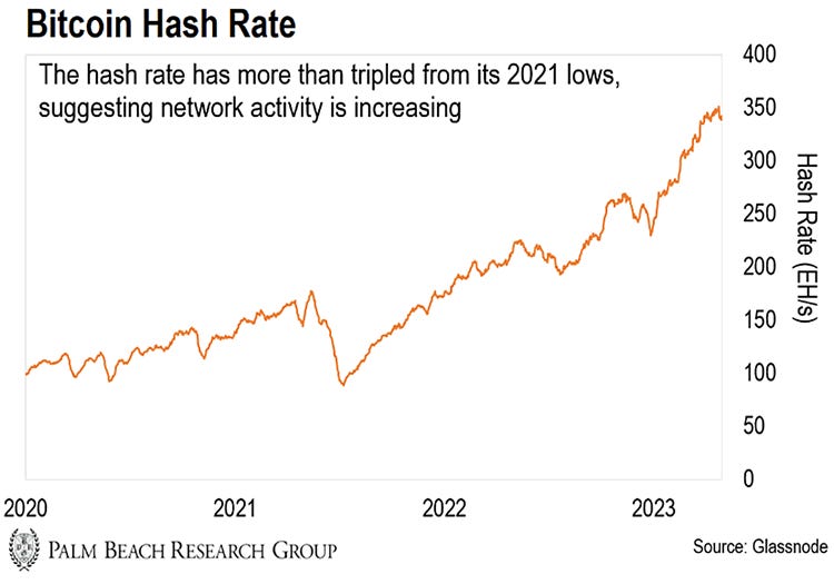 One measure of the strength of the bitcoin network is the hash rate. That shows the rising computational power needed to power the network.